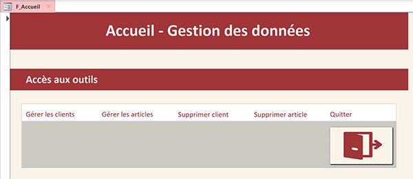 formation Access, nous proposons de bâtir un écran d'accueil par le biais d'un formulaire. Il doit se charger automatiquement avec l'application. C'est lui qui détermine les actions que l'utilisateur peut entreprendre. De fait, l'objectif parallèle consiste à restreindre toutes les autres opérations habituellement autorisées par