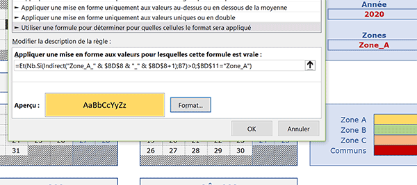 Nous sommes de retour sur la première boîte de dialogue. Elle indique explicitement que si la date est trouvée dans la zone A, pour l'année scolaire désignée, son arrière-plan se remplira d'orange. Il est conseillé à ce stade de sélectionner la syntaxe de la règle et de la copier. Nous pourrons ainsi la décliner plus facilement pour les zones B et C.