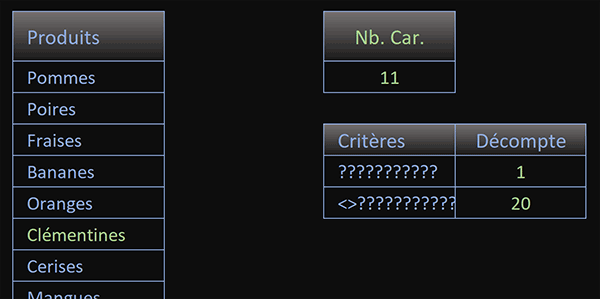 WildCard représente n'importe quelle lettre. Répété ainsi et utilisé en critère, il permet d'identifier toutes les cellules proposant le même nombre de caractères. Dans le second cas, avec l'opérateur d'inégalité en préfixe (<>), il permet au contraire d'identifier toutes les cellules ne comptant pas ce même nombre de lettres.