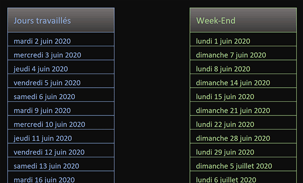 dates des Week-End, soit des jours de repos dans ce contexte particulier, le principe est le même. Il suffit d'adapter la codification en dernier argument de la