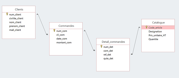 primaire num_com a déjà été ajoutée dans l'autre requête. ref_det est quant à elle la clé externe de la clé primaire Code_article de la table Catalogue que nous allons ajouter.