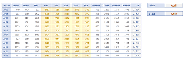 Nous réceptionnons donc le tableau des ventes. Il est situé entre les colonnes B et O et entre les lignes 5 et 15. Pour déterminer la plage à éditer, l'utilisateur peut émettre un mois de début à l'aide d'une liste déroulante en R5 et un mois de fin, à l'aide d'une autre liste déroulante en cellule R7. A ce stade, si vous commandez l'