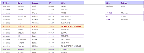 Nous sommes de retour sur la première boîte de dialogue qui résume le contexte. Un fond vert et une police violette doivent se déclencher sur toute la ligne recoupant le nom et le prénom cherchés.