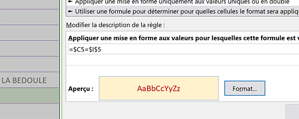 règle de mise en forme conditionnelle est donc parfaitement fonctionnelle. Désormais, nous souhaitons faire ressortir ces doublons sur le nom dans le même temps. Le critère est plus simple. Il consiste à opérer la correspondance, seulement sur le nom de famille.
