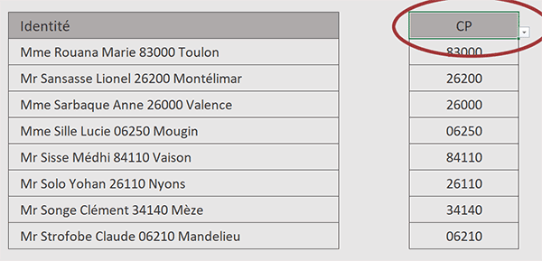 chaînes de textes. Il s'agit d'informations sur des personnes. Chaque donnée est séparée d'une autre par un espace. Sur la droite, l'utilisateur choisit l'information qu'il souhaite isoler, à l'aide d'une liste déroulante. En-dessous et instantanément, la donnée convoitée est extirpée de chaque chaîne. Nous le verrons, cette astuce en ouvrira une autre que nous démontrerons dans le volet suivant, pour choisir les colonnes d'extraction.