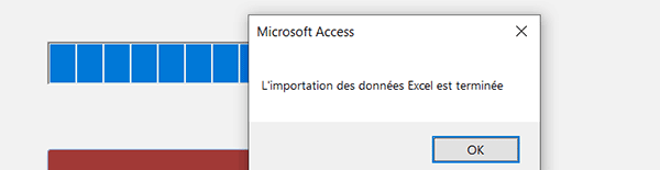 Comme vous pouvez le voir, le processus s'enclenche et la barre de progression rend compte de l'avancement. A l'issue, la boîte de dialogue programmée, informe l'utilisateur de la fin du traitement d'importation des données Excel.