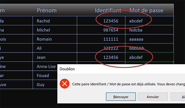 paire identifiant et mot de passe attribuée à un utilisateur n'est pas déjà empruntée.