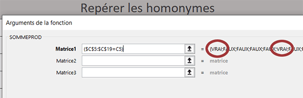 zone Matrice1. Chaque indicateur Vrai repère la position d'une concordance dans la matrice des noms avec celui qui est en cours d'analyse. Mais nous l'avons dit, nous avons besoin de travailler sur des chiffres pour que la