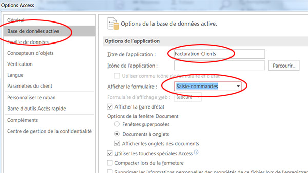 - Dans la boîte de dialogue, choisir la catégorie Base de données active dans la liste de gauche,